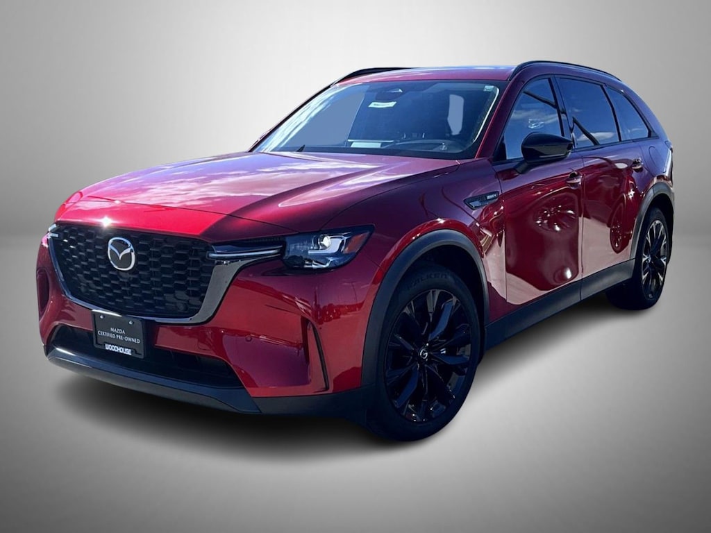 Certified. Soul Red Crystal Metallic 2025 Mazda CX-90 PHEV Premium AWD 8-Speed Automatic 2.5L 4-Cylinder Mazda Certified Pre-Owned Certified, 2.5L 4-Cylinder, 12 Speakers, 2nd-Row Captain's Chairs, 3rd row seats: bench, 4-Wheel Disc Brakes, ABS brakes, Air Conditioning, Alloy wheels, AM/FM radio: SiriusXM, Auto High-beam Headlights, Auto-dimming Rear-View mirror, Automatic temperature control, Brake assist, Bumpers: body-color, Compass, Delay-off headlights, Driver door bin, Driver vanity mirror, Dual front impact airbags, Dual front side impact airbags, E911 Automatic Emergency Notification, Electronic Stability Control, Emergency communication system: MAZDA CONNECT, Exterior Parking Camera Rear, Four wheel independent suspension, Front anti-roll bar, Front Bucket Seats, Front Center Armrest w/Storage, Front dual zone A/C, Front reading lights, Fully automatic headlights, Garage door transmitter: HomeLink, Heads-Up Display, Heated door mirrors, Heated Front Bucket Seats, Heated front seats, Illuminated entry, Infotainment System Voice Command, Knee airbag, Leather Seat Trim, Leather Shift Knob, Leather steering wheel, Low tire pressure warning, Mazda Connected Services, Mazda Navigation System, Memory seat, Navigation system: MAZDA CONNECT, Occupant sensing airbag, Outside temperature display, Overhead airbag, Overhead console, Pandora Internet Radio Integration, Panic alarm, Passenger door bin, Passenger vanity mirror, Power door mirrors, Power driver seat, Power Liftgate, Power moonroof, Power passenger seat, Power steering, Power windows, Radio Broadcast Data System Program Information, Radio data system, Radio: AM/FM w/HD/Bose 12-Speaker Sound System, Rain sensing wipers, Rear air conditioning, Rear anti-roll bar, Rear reading lights, Rear seat center armrest, Rear window defroster, Rear window wiper, Remote keyless entry, SMS Text Msg Audio Delivery & Reply, Soul Red Crystal Metallic Paint Charge, Speed control, Speed-sensing steering, Split folding rear seat, Spoiler, Steering wheel mounted audio controls, Tachometer, Telescoping steering wheel, Tilt steering wheel, Traction control, Trip computer, Turn signal indicator mirrors, Variably intermittent wipers, Wheels: 21" x 9.5J Aluminum Alloy, 2.5L 4-Cylinder.