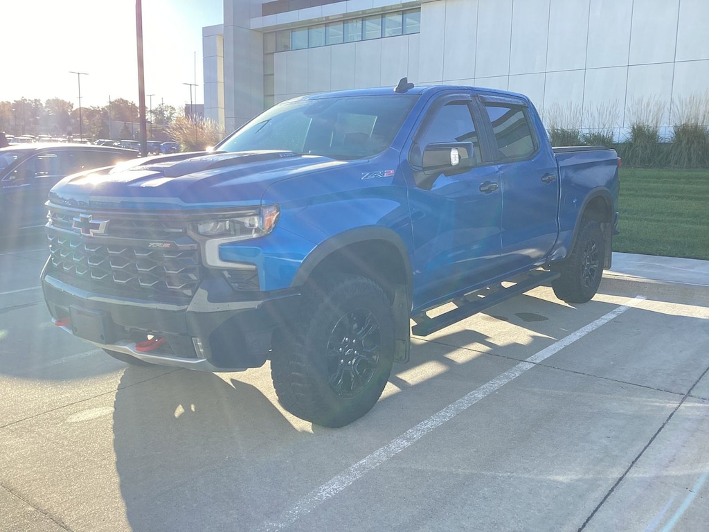 Glacier Blue Metallic 2023 Chevrolet Silverado 1500 ZR2 4WD 10-Speed Automatic EcoTec3 6.2L V8 10-Speed Automatic, 4WD, Jet Black/Graystone Leather, 10-Way Power Driver Seat w/Lumbar, 10-Way Power Passenger Seat Adjuster w/Lumbar, 12.3" Multicolor Reconfigurable Digital Display, 120-Volt Bed Mounted Power Outlet, 120-Volt Instrument Panel Power Outlet, 15" Diagonal Multicolor Head-Up Display, 170 Amp Alternator, 2 USB Data Ports, 2nd Row Heated Outboard Seats, 3.23 Rear Axle Ratio, 4-Wheel Disc Brakes, 7 Speakers, ABS brakes, Adaptive Cruise Control, Air Conditioning, All-Weather Floor Liner (LPO), Alloy wheels, AM/FM radio: SiriusXM with 360L, Apple CarPlay/Android Auto, Auto High-beam Headlights, Auto-dimming door mirrors, Auto-Dimming Inside Rear-View Mirror, Auto-dimming Rear-View mirror, Auto-Locking Rear Differential, Automatic Emergency Braking, Automatic temperature control, Bed View Camera, Bluetooth® For Phone, Brake assist, Chevrolet Connected Access Capable, Chevytec Spray-On Black Bedliner, Color-Keyed Carpeting Floor Covering, Compass, Deep-Tinted Glass, Delay-off headlights, Driver door bin, Driver Memory, Driver vanity mirror, Dual Exhaust, Dual front impact airbags, Dual front side impact airbags, Dual Rear USB Ports (Charge Only), Electric Rear-Window Defogger, Electrical Steering Column Lock, Electronic Cruise Control, Electronic Stability Control, Electronic Transmission Range Selector Shifter, Engine Block Heater, EZ Lift Power Lock & Release Tailgate, Floor Mounted Center Console, Following Distance Indicator, Forward Collision Alert, Front anti-roll bar, Front Bucket Seats, Front Center Armrest, Front dual zone A/C, Front fog lights, Front LED Fog Lamps, Front License Plate Kit, Front Pedestrian Braking, Front Rainsensing Wipers, Front reading lights, Front wheel independent suspension, Fully automatic headlights, Garage door transmitter, HD Surround Vision, Heated door mirrors, Heated Driver & Front Outboard Passenger Seats, Heated front seats, Heated rear seats, Heated Steering Wheel, Heated steering wheel, Heavy-Duty Air Filter, High Gloss Black Mirror Caps, Hill Descent Control, Hitch Guidance, Hitch Guidance w/Hitch View, Illuminated entry, Integrated Trailer Brake Controller, IntelliBeam Automatic High Beam On/Off, Keyless Open & Start, Lane Keep Assist w/Lane Departure Warning, LED Cargo Area Lighting, Low tire pressure warning, Manual Tilt/Telescoping Steering Column, Memory seat, Not Equipped w/Steering Column Lock, Occupant sensing airbag, OnStar & Chevrolet Connected Services Capable, Outside Heated Power-Adjustable Mirrors, Outside temperature display, Overhead airbag, Overhead console, Panic alarm, Passenger door bin, Passenger vanity mirror, Perforated Leather Seat Trim, Performance Red Recovery Hooks, Perimeter Lighting, Power door mirrors, Power driver seat, Power Front Passenger Windows w/Express Up/Down, Power Front Windows w/Driver Express Up/Down, Power passenger seat, Power Rear Windows w/Express Down, Power Sliding Rear Window w/Rear Defogger, Power steering, Power Sunroof, Power Tailgate, Power Tilt & Telescoping Steering Column, Power windows, Preferred Equipment Group 3LT, Premium audio system: Chevrolet Infotainment 3 Premium, Premium Bose 7-Speaker Sound System, Radio data system, Radio: Chevrolet Infotainment 3 Premium System, Rain sensing wipers, Rear Camera Mirror, Rear Cross Traffic Alert-Braking, Rear Park Assist, Rear Parking Sensors, Rear Pedestrian Alert, Rear reading lights, Rear seat center armrest, Rear step bumper, Rear Wheelhouse Liners, Rear window defroster, Remote keyless entry, Remote Vehicle Starter System, Safety Alert Seat, Security system, SiriusXM w/360L, Speed control, Speed-sensing steering, Split folding rear seat, Standard Tailgate, Steering Wheel Audio Controls, Steering wheel mounted audio controls, Tachometer, Technology Package, Telescoping steering wheel, Theft Deterrent System (Unauthorized Entry), Tilt steering wheel, Traction control, Trailer