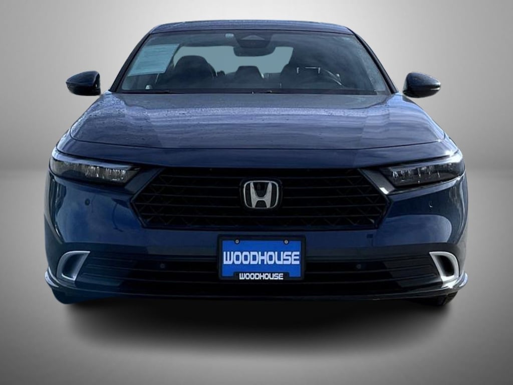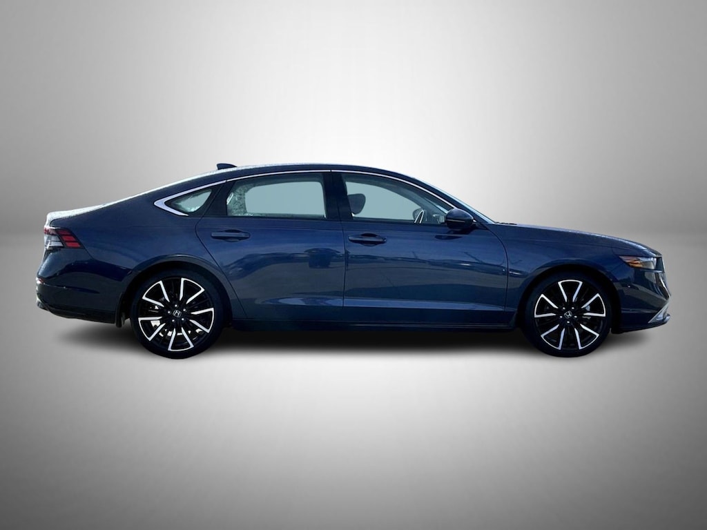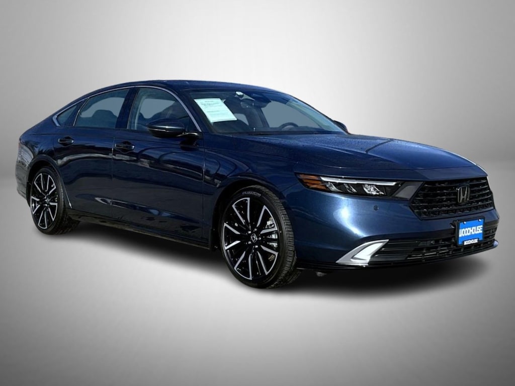 Blue 2023 Honda Accord Hybrid Touring FWD eCVT 4 cylinder 4 cylinder, 12 Speakers, 4-Wheel Disc Brakes, ABS brakes, Adaptive Cruise Control: Adaptive Cruise Control (ACC) with Low-Speed Follow, Adaptive suspension, Air Conditioning, Alloy wheels, AM/FM radio, Apple CarPlay/Android Auto, Auto High-beam Headlights, Auto-dimming Rear-View mirror, Automatic temperature control, Blind Spot Information (BSI) System warning, Bose Premium Sound System, Brake assist, Bumpers: body-color, Compass, Delay-off headlights, Driver door bin, Driver vanity mirror, Dual front impact airbags, Dual front side impact airbags, Electronic Stability Control, Emergency communication system: HondaLink, Exterior Parking Camera Rear, Four wheel independent suspension, Front anti-roll bar, Front Bucket Seats, Front Center Armrest, Front dual zone A/C, Front reading lights, Fully automatic headlights, Heads-Up Display, Heated & Ventilated Front Bucket Seats, Heated door mirrors, Heated front seats, Heated rear seats, Illuminated entry, Knee airbag, Lane departure: Lane Keeping Assist System (LKAS) active, Leather Shift Knob, Leather steering wheel, Leather-Trimmed Seat Trim, Low tire pressure warning, Memory seat, Navigation system: Google Built-In, Occupant sensing airbag, Outside temperature display, Overhead airbag, Overhead console, Panic alarm, Passenger door bin, Passenger vanity mirror, Power door mirrors, Power driver seat, Power moonroof, Power passenger seat, Power steering, Power windows, Radio data system, Rain sensing wipers, Rear anti-roll bar, Rear reading lights, Rear seat center armrest, Rear side impact airbag, Rear window defroster, Remote keyless entry, Security system, Speed control, Speed-sensing steering, Speed-Sensitive Wipers, Split folding rear seat, Steering wheel mounted audio controls, Telescoping steering wheel, Tilt steering wheel, Traction control, Trip computer, Turn signal indicator mirrors, Variably intermittent wipers, Ventilated front seats, Wheels: 19" x 8.5J Berlina Black, 4 cylinder.